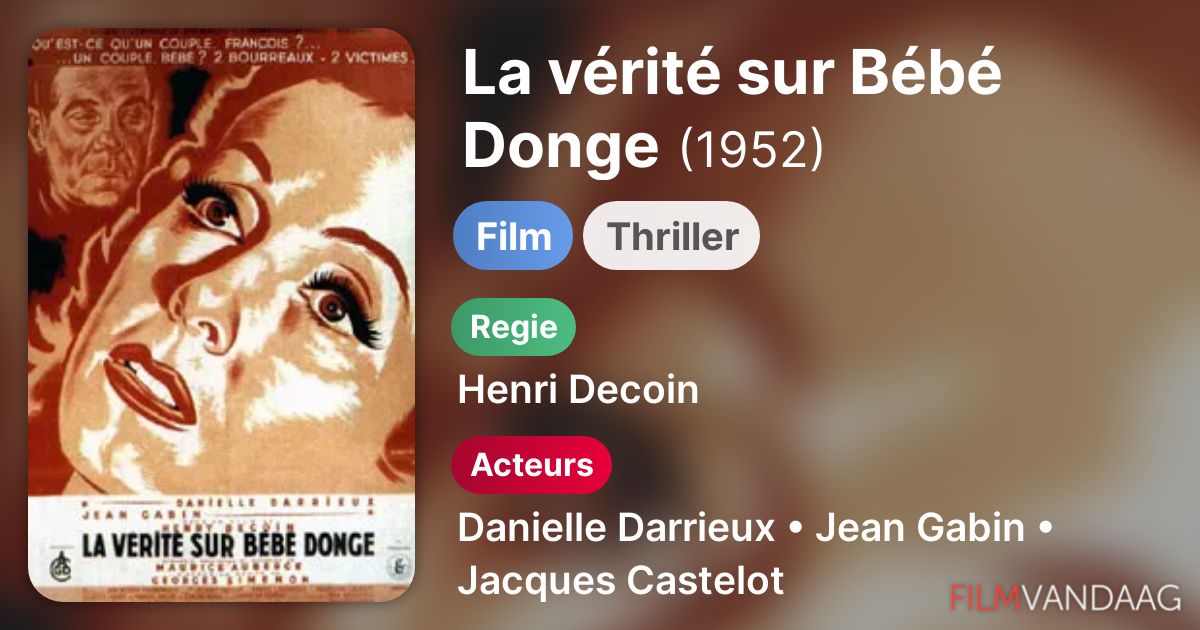 La Vérité sur Bébé Donge (aka The Truth About Bebe Donge or UK title: The Truth of Our Marriage) is a 1952 French drama thriller film directed by Henri Decoin and starring Danielle Darrieux and Jean Gabin.The plot is essentially the analysis of a couple's marriage that has broken down; the film is based on the novel by Georges Simenon.