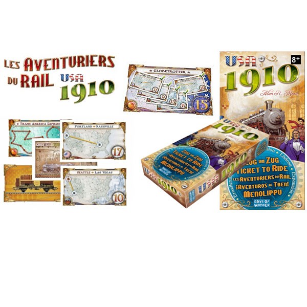 Les Aventuriers du Rail - USA 1910 est une nouvelle extension pour le jeu Les Aventuriers du Rail. Elle contient 181 cartes grand format (celui des cartes de la version Europe) : 39 nouvelles cartes Destination, une nouvelle carte bonus Globe Trotter pour le joueur ayant réussi le plus de cartes Destination, et un paquet complet de cartes de remplacement du jeu original.