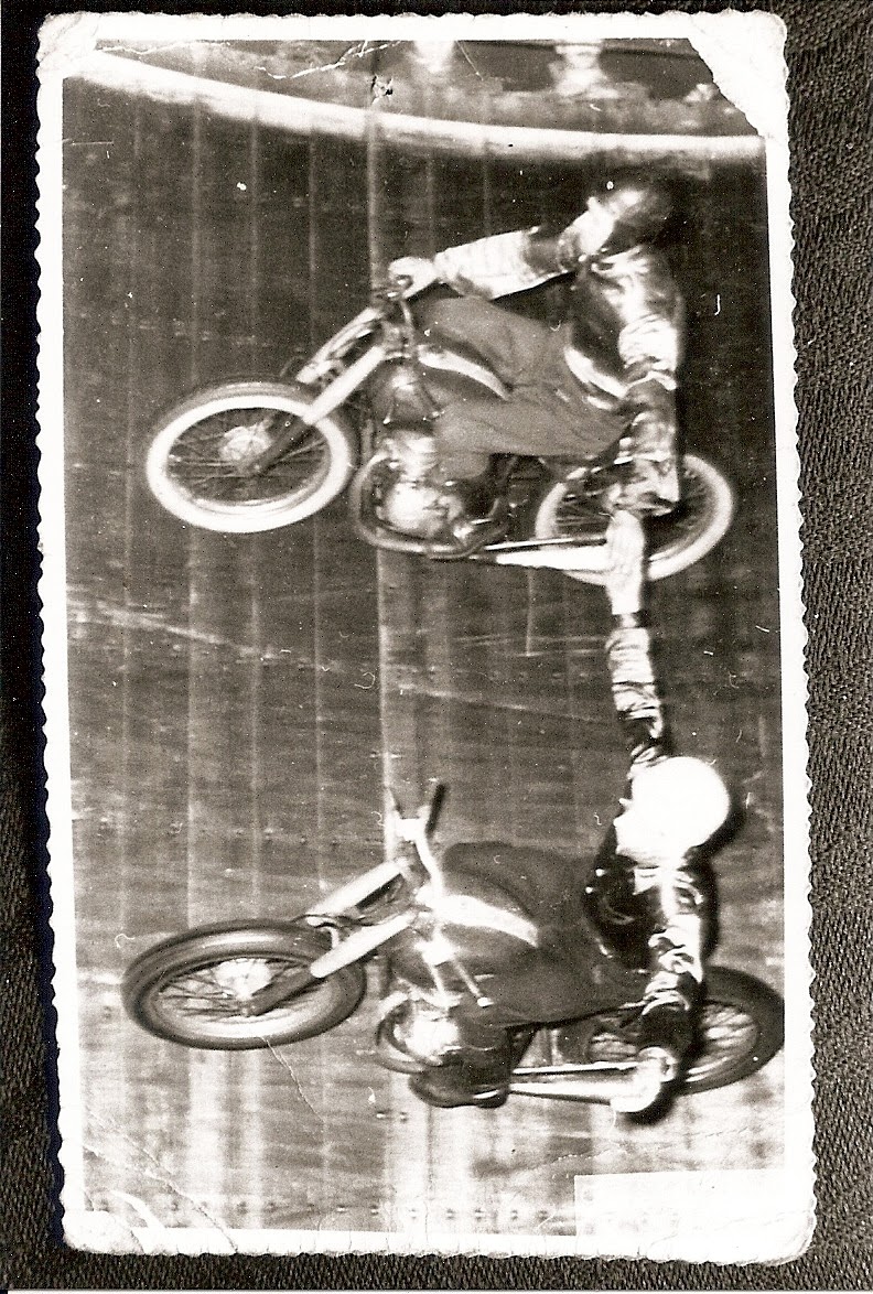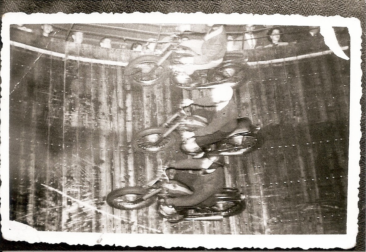 Historique du mur de la mort - Wall of death gypsy. A vélo, à motos et en auto, à partir de 1933, et pendant des années, la famille Coutard fait vibrer les foules dans des numéros défiant les lois de l'apesanteur. Parmi les attractions motocyclistes de l'après-guerre, mur et boule de la mort font partie des plus folles.