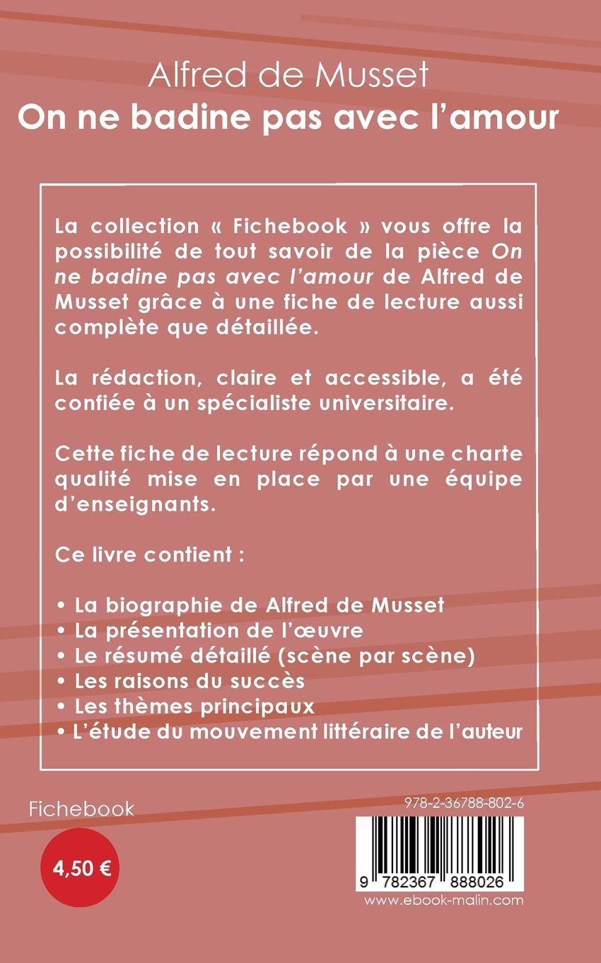 Fiche de lecture On ne badine pas avec l'amour : Présentation de la pièce. La pièce On ne badine pas avec l'amour d'Alfred de Musset, est publiée en 1834. Écrite juste après la rupture de Musset avec George Sand, elle ne sera représentée sur scène qu'après la mort de son auteur, en 1861. On peut considérer cette pièce comme.